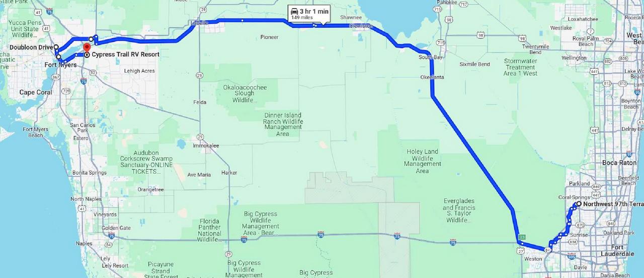 150 miles via I-75, US 27, FL 80, FL 78 and US 41. Cumulative route miles: 1775. Cumulative auto miles: 1934. No lunch stop, no refueling stop, no bio break. The fishhook at the end, to stop at Doubloon Drive in North Ft Myers, was to retrieve Becky, Marlene’s pup. The extra auto mile in Coral Springs were the result of two trips to the casino and some shopping trips.