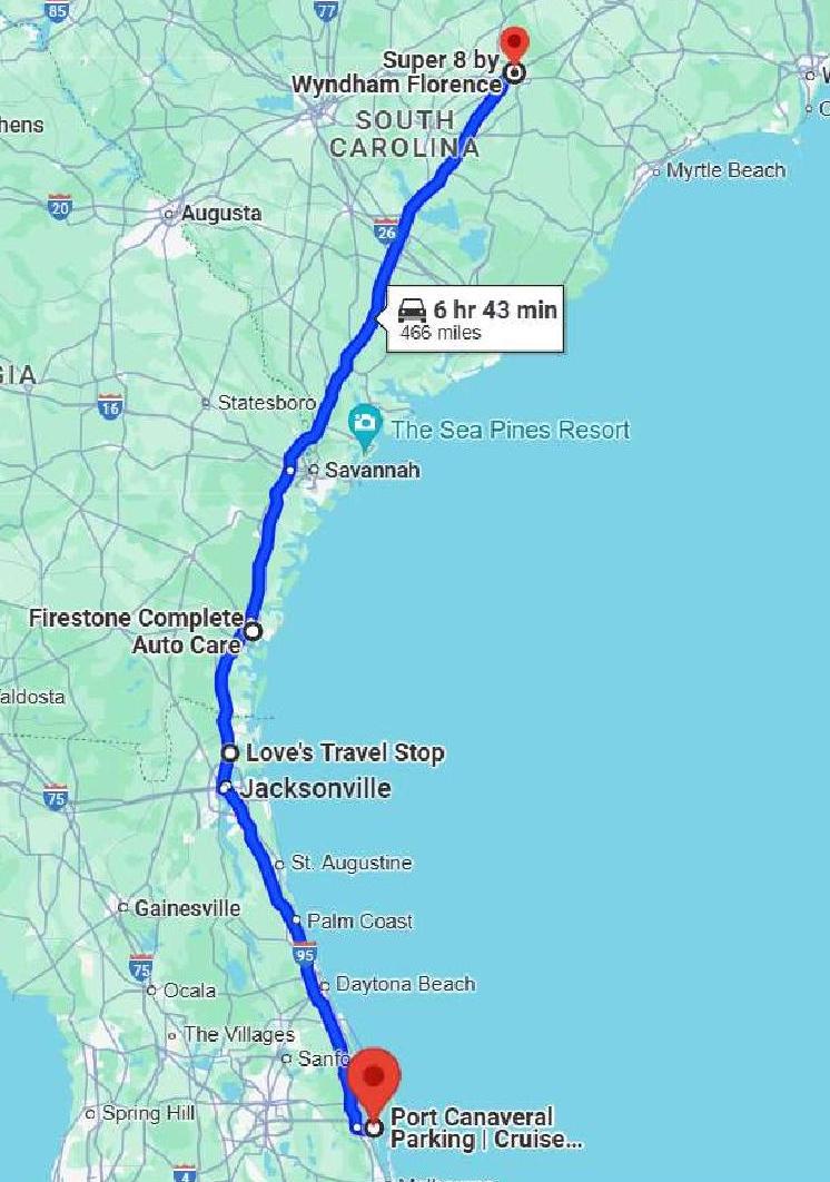466 miles via I-95 and a bunch of local roads in Brunswick GA. Auto miles: 479 (the extra miles driven in Brunswick GA looking for a tire – see below). Cumulative route miles: 659. Cumulative auto miles: 684.