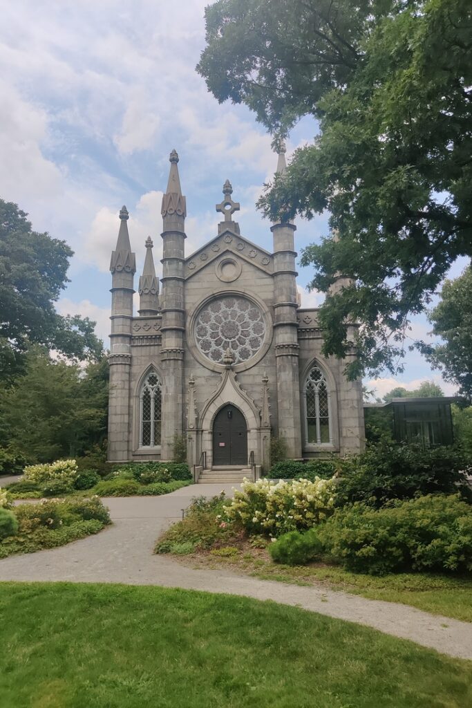 On our way to the service we stopped at the Mt Auburn Cemetery in Cambridge MA. I like cemeteries in general and this is one of my favorites – huge, beautifully maintained and a de facto arboretum as all of the trees are labeled. It is a great place to watch birds too. A number of famous people, including Mary Baker Eddy, the founder of Christian Science and Robert Gould Shaw, Civil War hero, are buried there. It has some nice crypts and chapels too. If you are ever looking for a nice cemetery to visit, try this one.