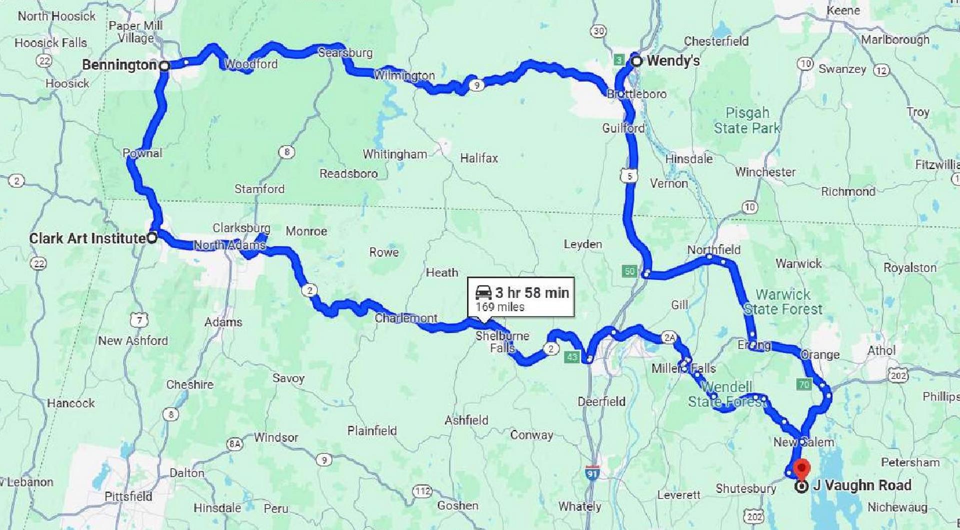 I chose to return to the cabin via VT. This added a few minutes to the travel time, but gave us different things to view and gave Marlene her first entry into VT. It also allowed us to stop at the Wendy’s in Brattleboro as we were both craving a Frosty.