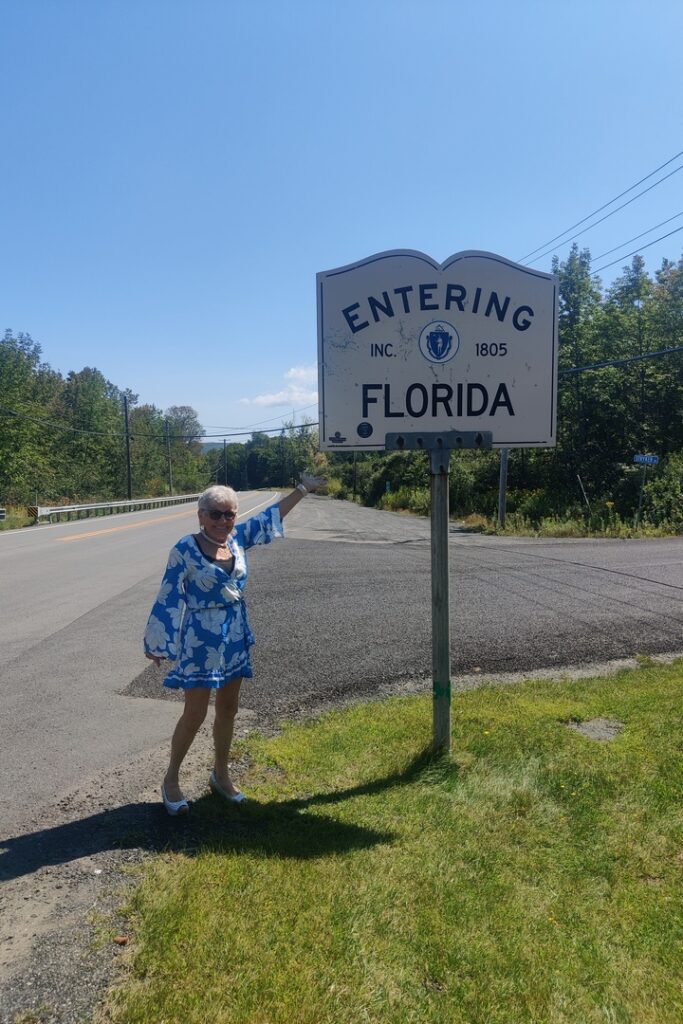 One of the towns that we went through was Florida MA. So of course we had to get a picture of the “entering Florida” sign. We sent it to Marlene’s brother, telling him that we had a big fight and I immediately drove her to Florida.