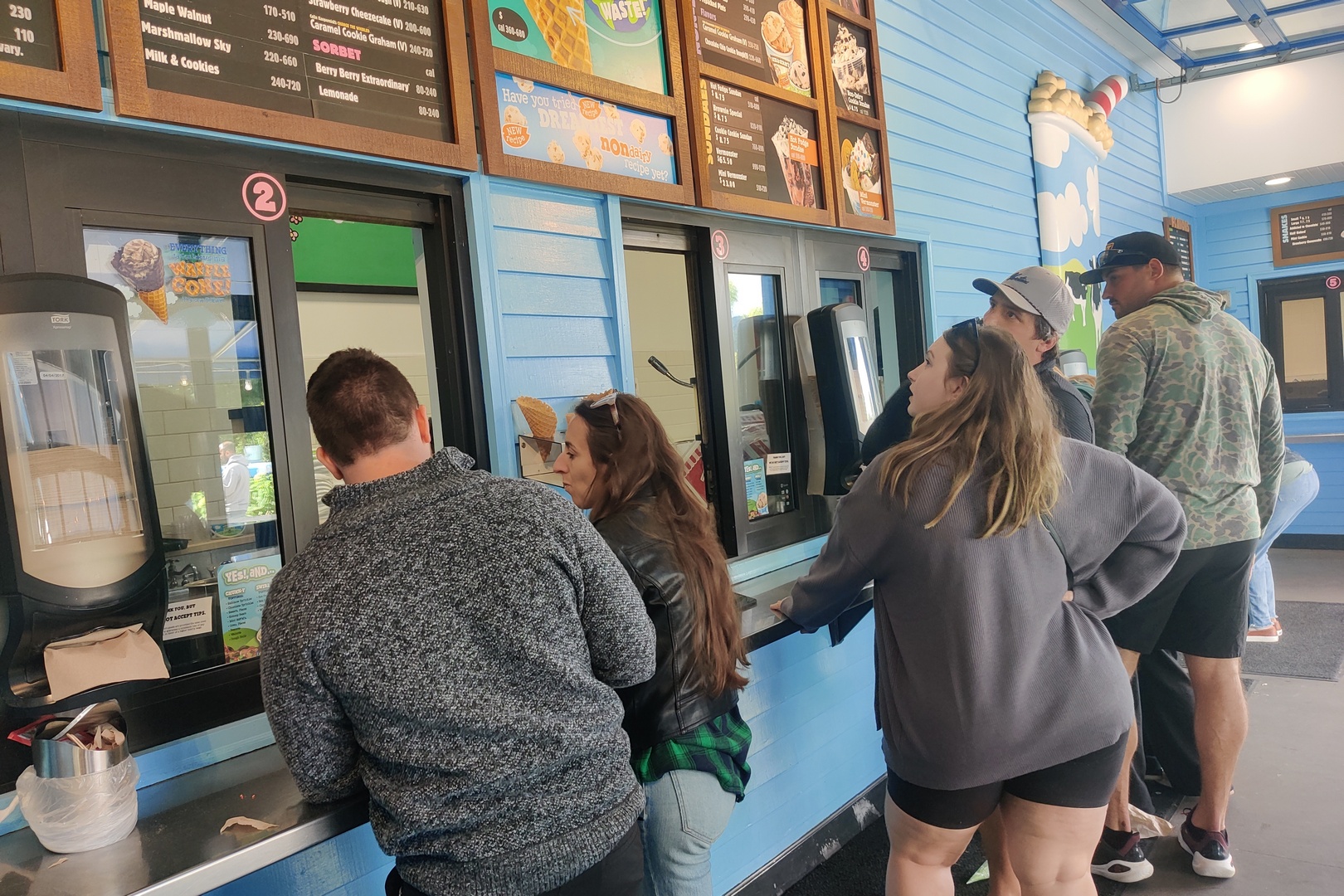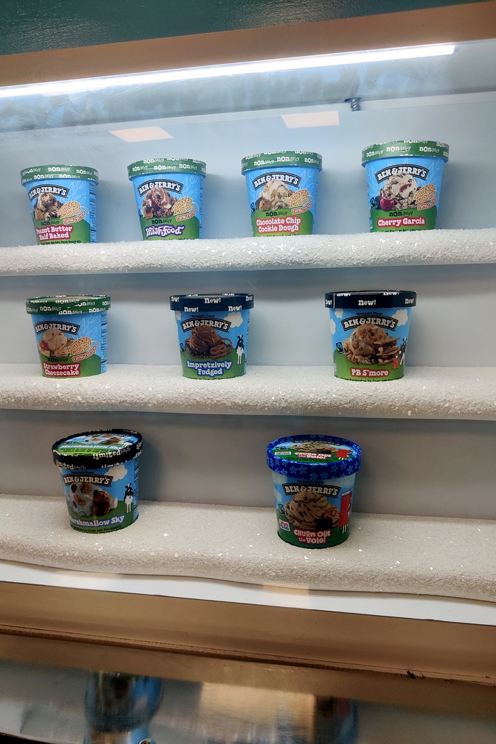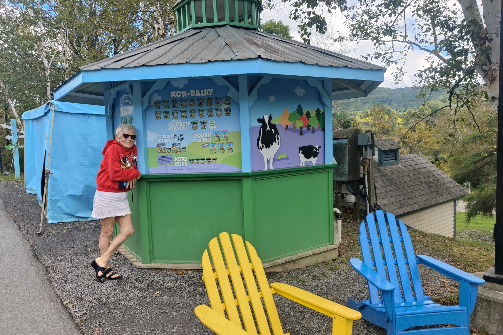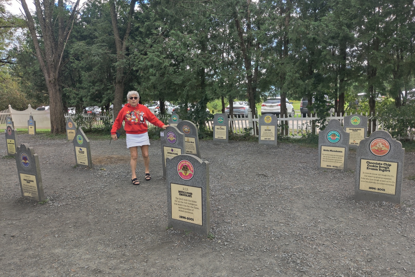 We got a late start and had to hustle to get to the Ben & Jerry’s tour for the 1:30 start (yes, you need to reserve a time to do this tour). In fact we didn’t make it on time – we arrived at the tour desk at 1:40. But we were allowed to hurry upstairs and join the group, missing only the 10-minute video. We saw the production floor, which was very small compared to the Tillamook cheese factory. But there is a second factory in NH which produces most of the B&J products so this original factory is now the public face of the corporation. It is also where new flavors are created. And where decisions about terminating flavors are made. One of the fun features of the site is a “flavor graveyard” that contains a headstone for each flavor that has been withdrawn.