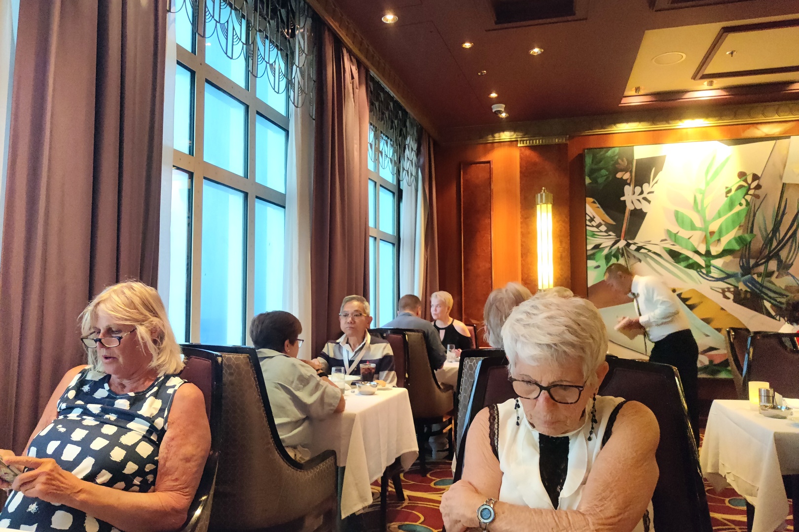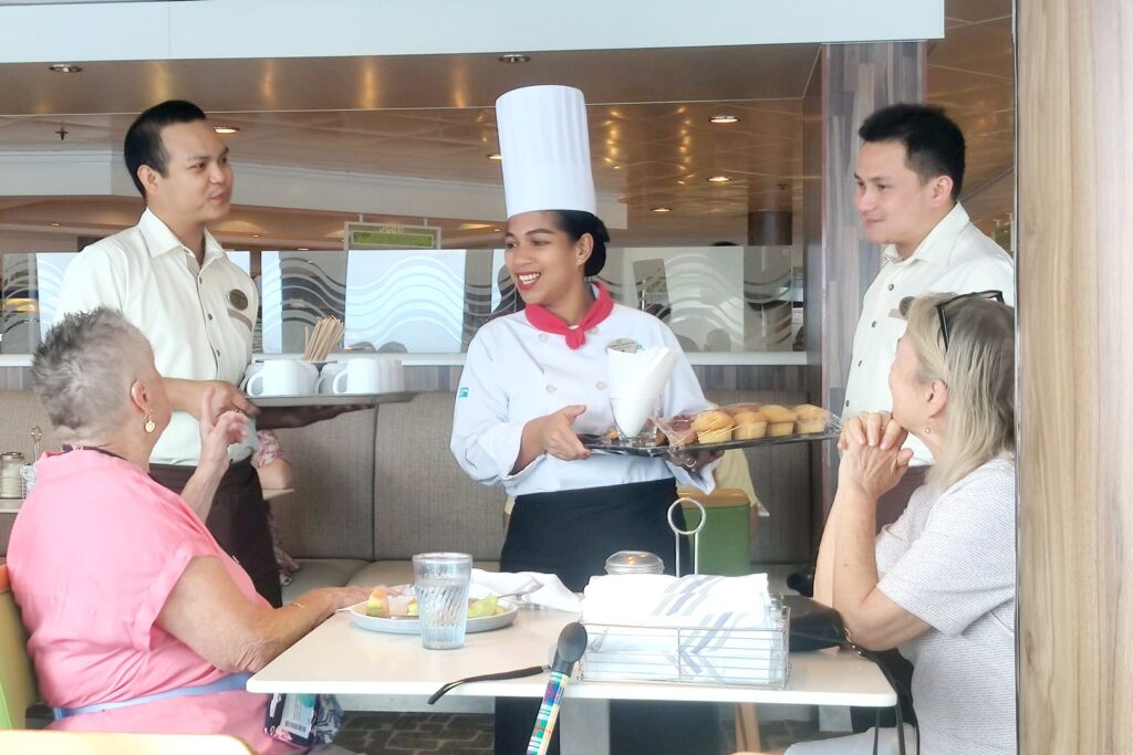 We started the day, as usual, by chatting with fellow passengers at breakfast in the buffet. One of the unexpected pleasures so far is the breakfast singing coffee trio. They serve coffee while singing coffee-themed songs, such as “Coffee Queen” (to the tune of “Dancing Queen”). Fun.