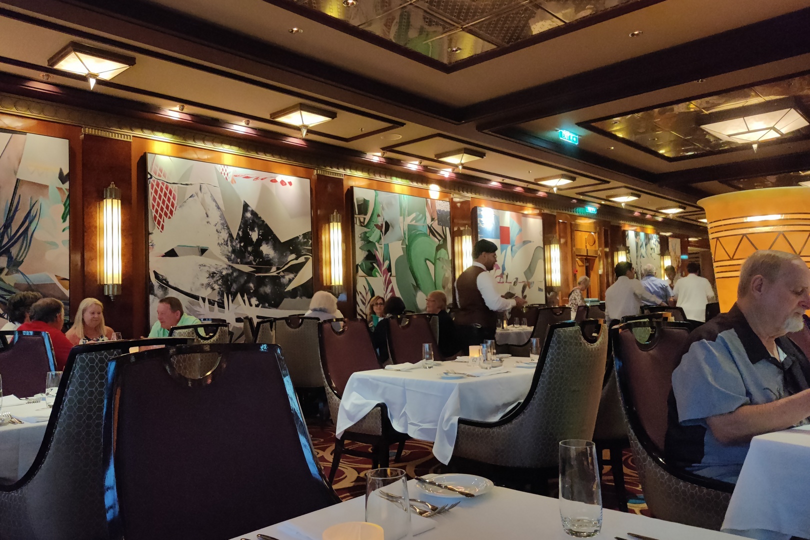 We had dinner in the second main restaurant – the one at the rear of the ship. We got a table very near the back and had a nice view of the ocean. This dining room is just a bit fancier than the other, partly due to the presence of the ocean. But the ceilings are also higher which gives it a grander feel.