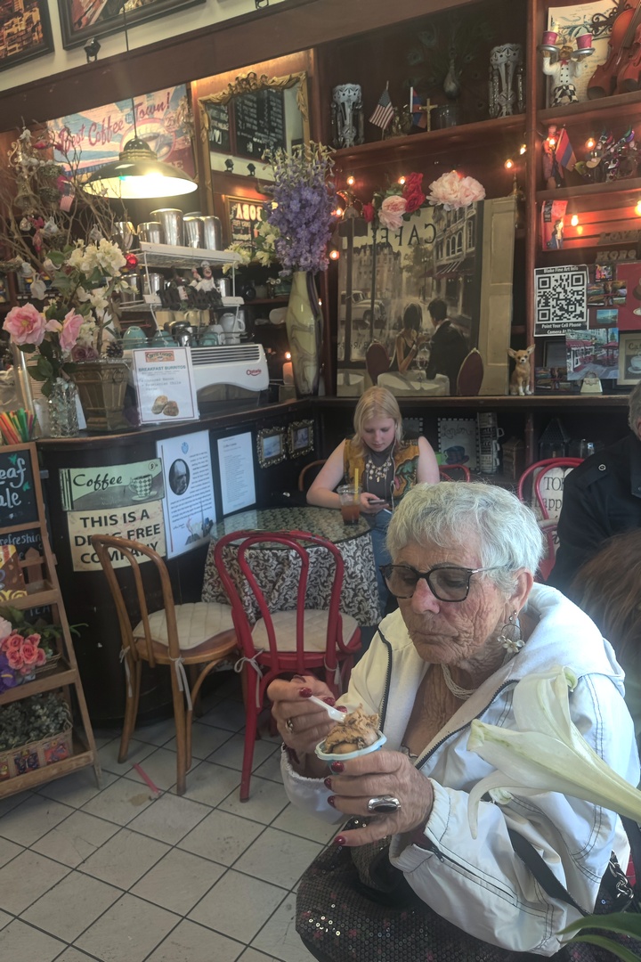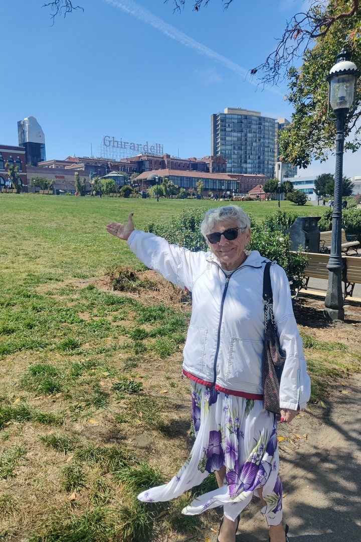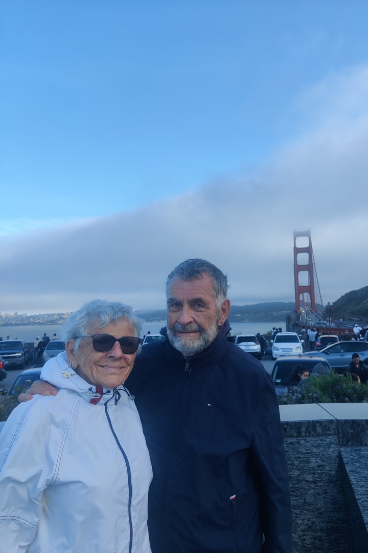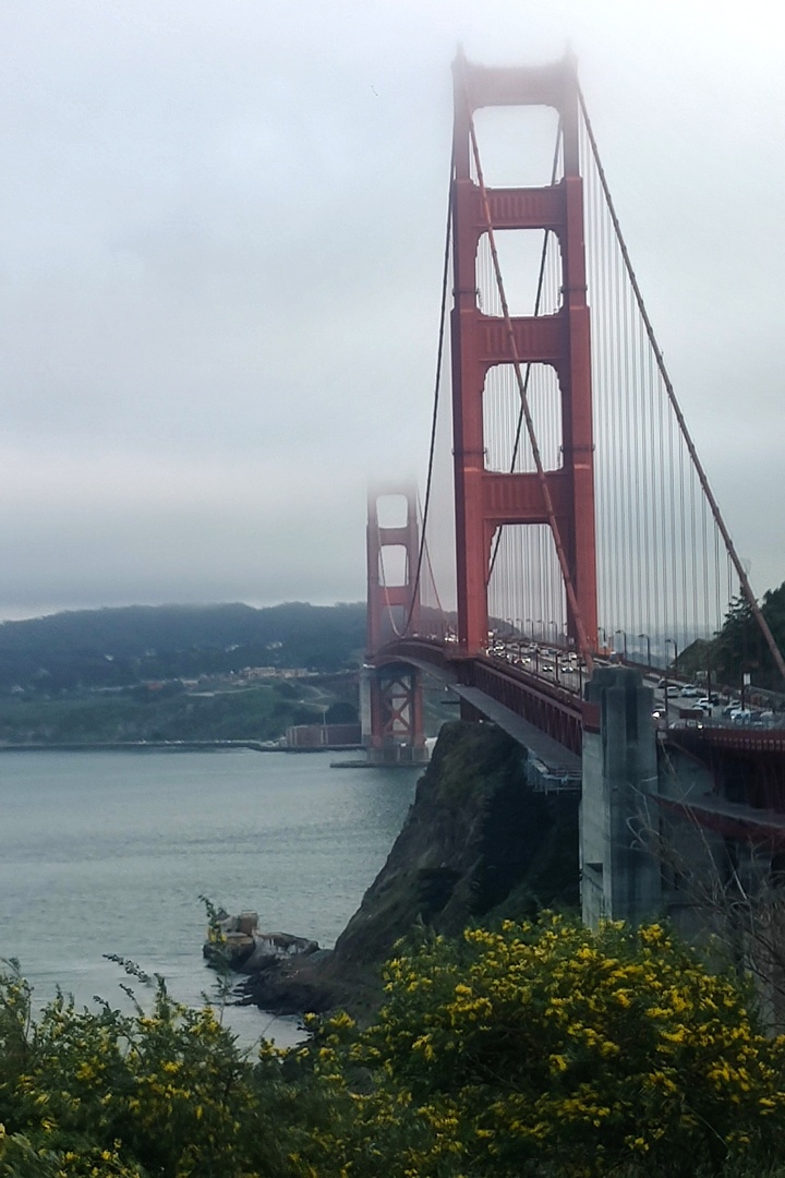 We continued the bus tour and got off in Haight-Ashbury, the funky ’60s hippie neighborhood. It is still a vibrant community. We found a nice coffee shop where we had coffee, gelato and a cookie (and a much-needed bio break). Marlene found a Goodwill and bought another dress. Then we got back on the bus to go over the Golden Gate Bridge.
