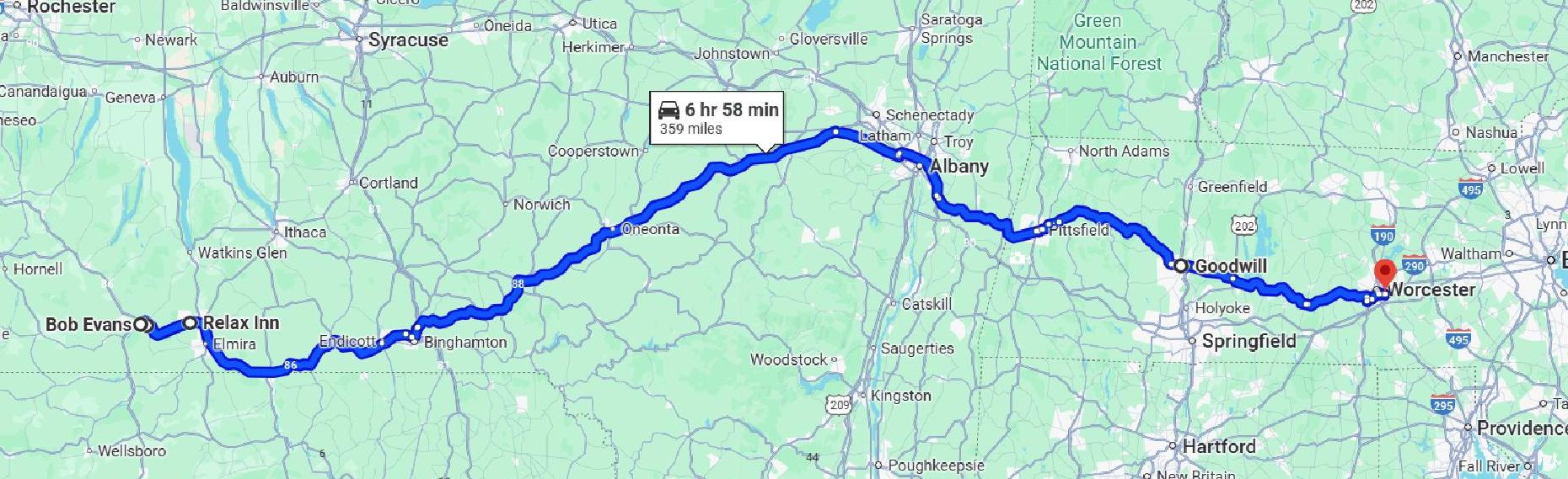 We departed the museum before noon, headed to Worcester MA. I intended to take non-toll roads through NY (because the SunPass transponder on Marlene’s car was not one that was recognized in NY) and then take the Massachusetts Turnpike through MA. But we had time and so decided to take non-toll roads the entire way. That probably added an hour to our travel time. But the route was pleasant. The weather was not – cloudy, foggy with occasional drizzle. We stopped in Northampton at the Goodwill to let Marlene shop and both of us to get a bio break. Becky too. Then on to Worcester. We arrived just before 8pm.
