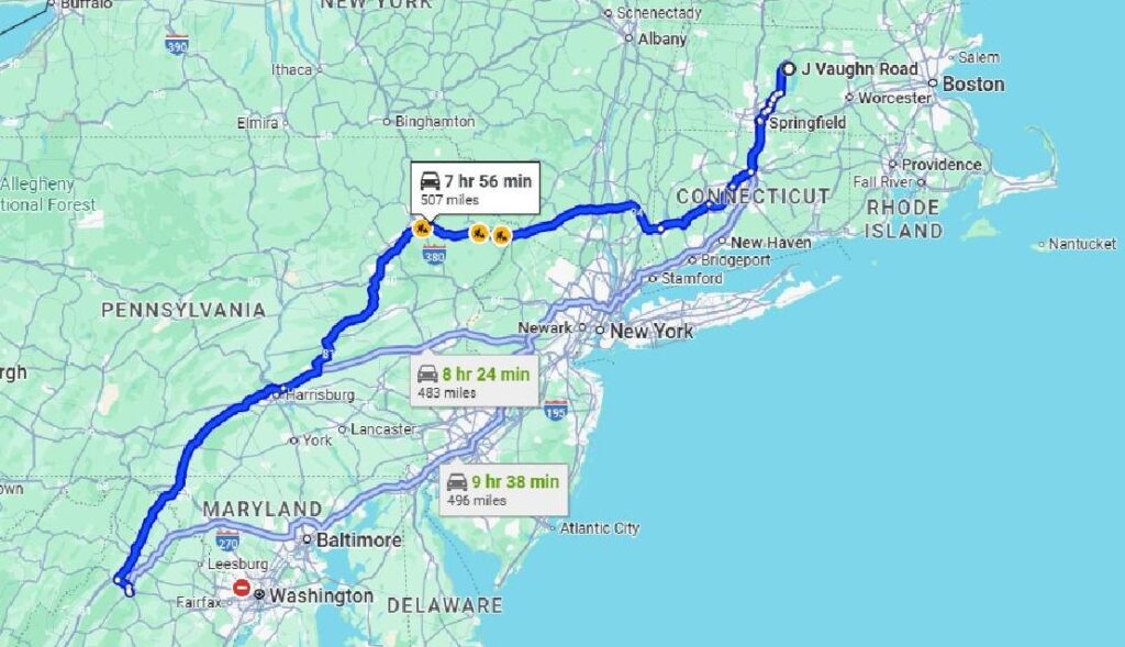 505 miles via US 202, I-291 (north of Springfield MA), I-91, I-84, I-81 and US 340. We stopped for fuel in Belchertown MA and took a bio break and picnic lunch in PA where Marlene took over the driving for the last 200 miles. Auto miles: 505. Cumulative route miles: 505. Cumulative auto miles: 505.