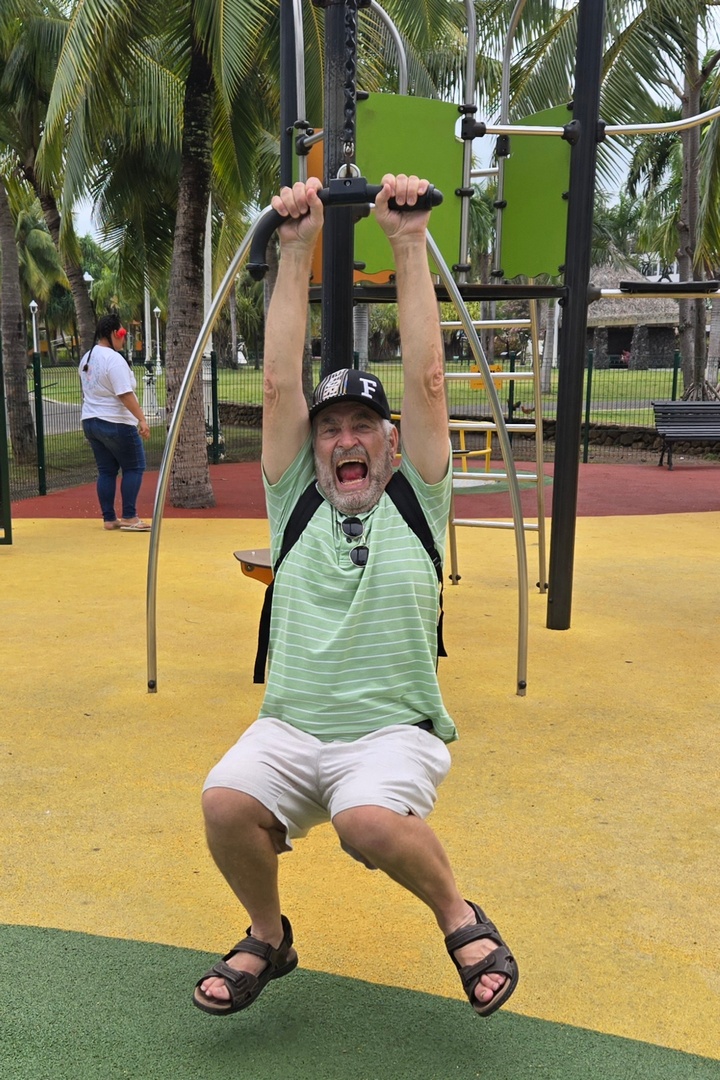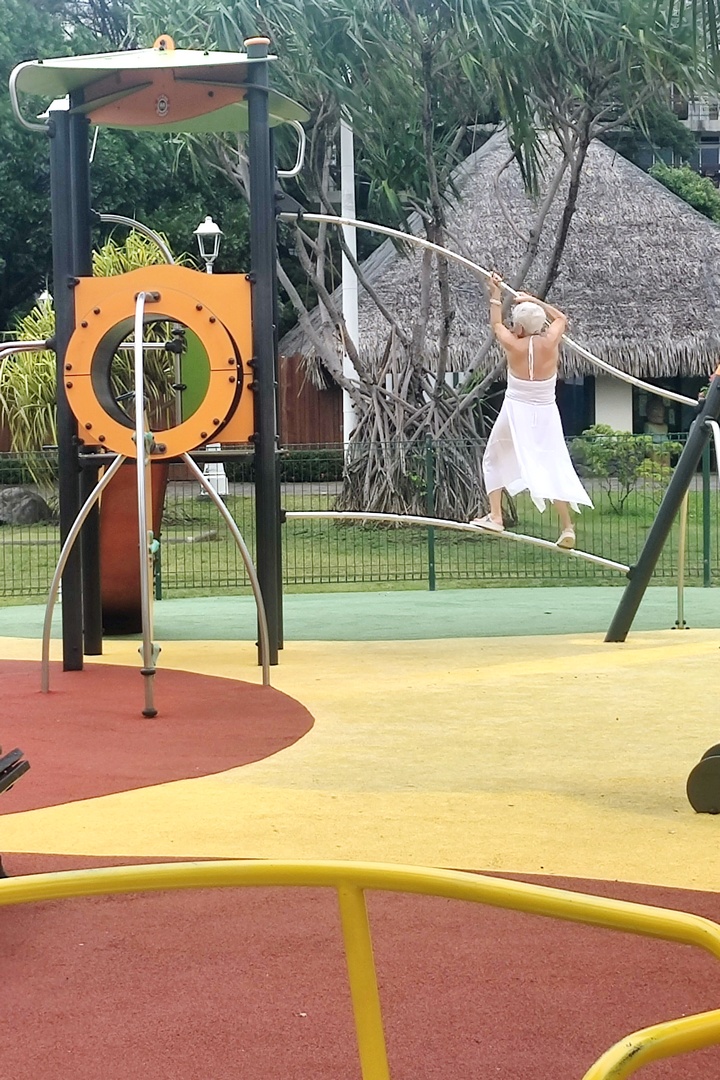 Being both frugal and unprepared for this portion of the trip, we did not plan on an excursion. Instead we toured the city on foot, hitting several of the places on Trip Advisor’s list of the best free places to visit. The ship docked very close to the center of the city so we walked just a few blocks to the Municipal Market which is basically a large indoor flea market. We didn’t stay long as all of the stalls there seemed to have implemented “cruise ship pricing” – everything was VERY expensive. We passed by a cute yellow church and fed some feral chickens on our way to the Paofai Gardens, a large waterfront park. We played a bit on the playground there before heading back into the city.