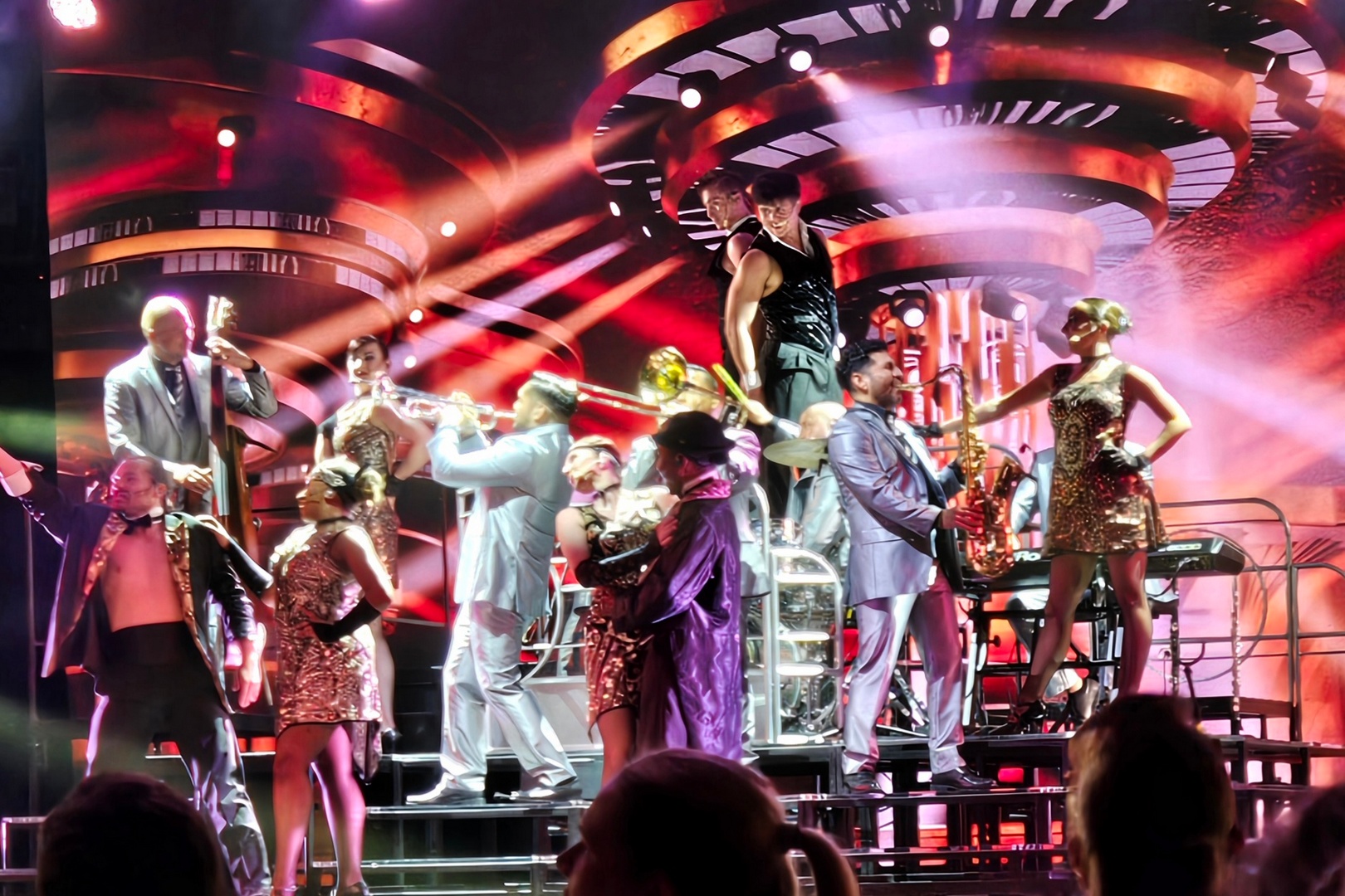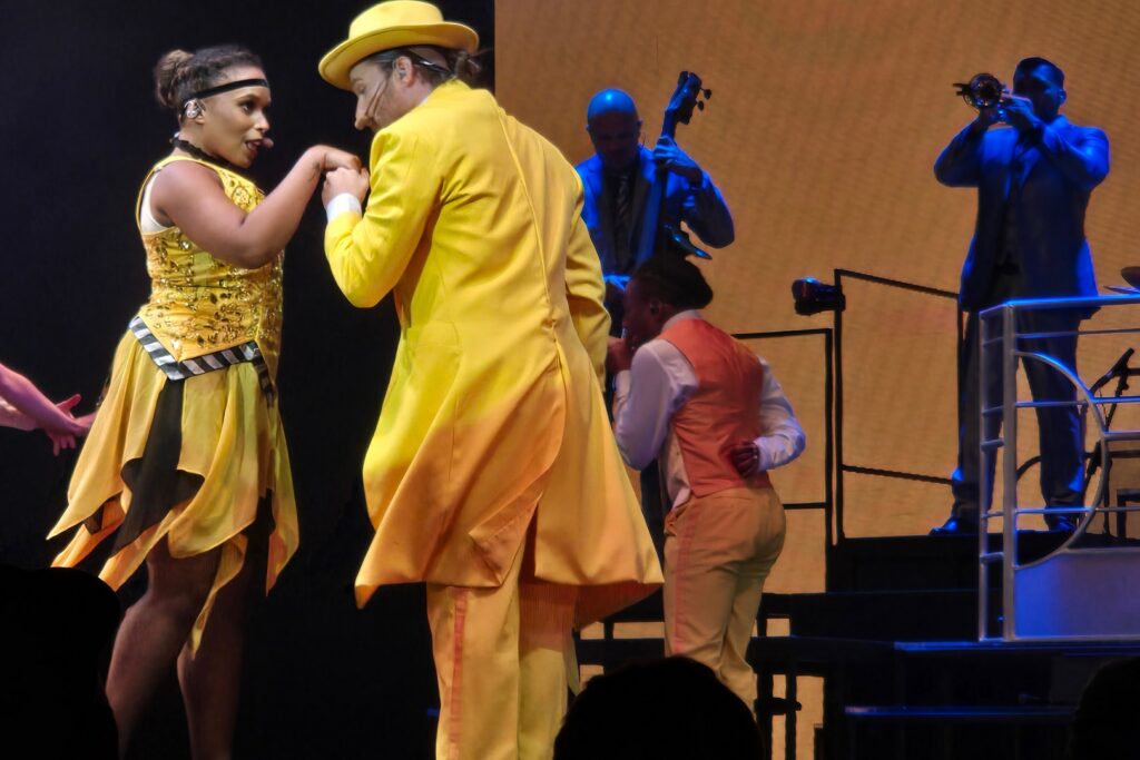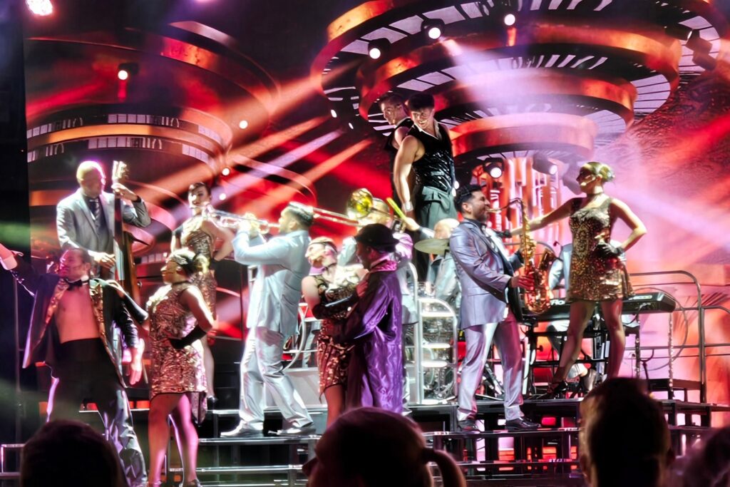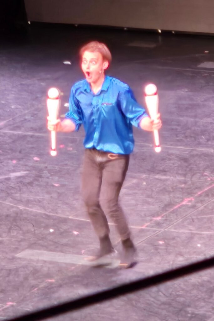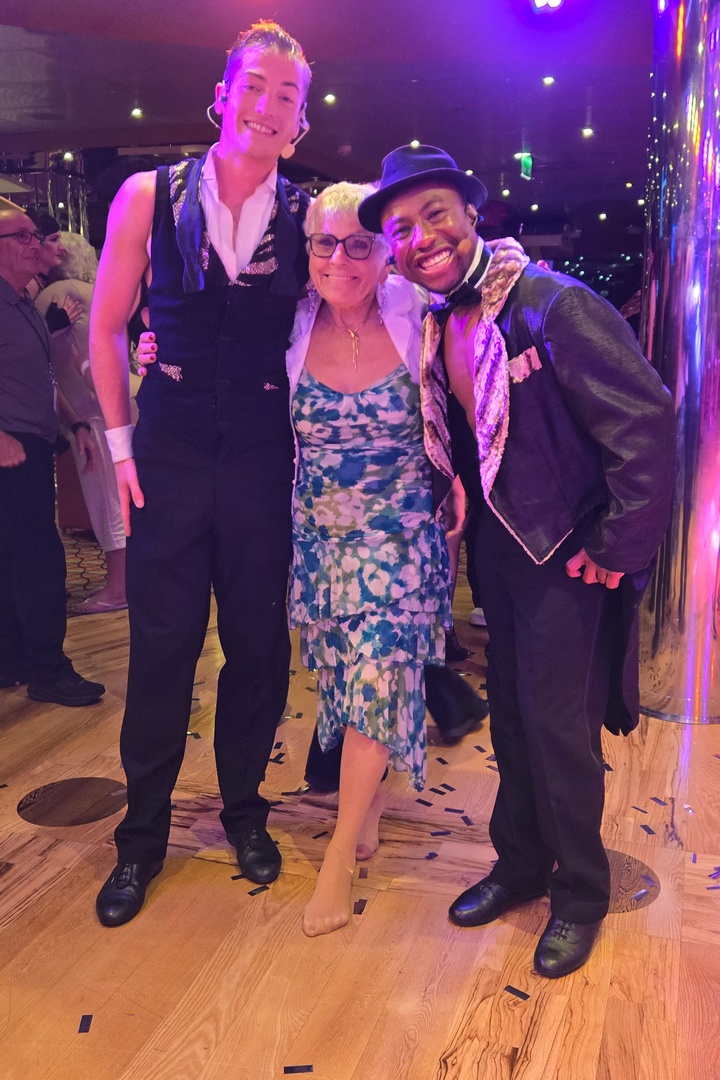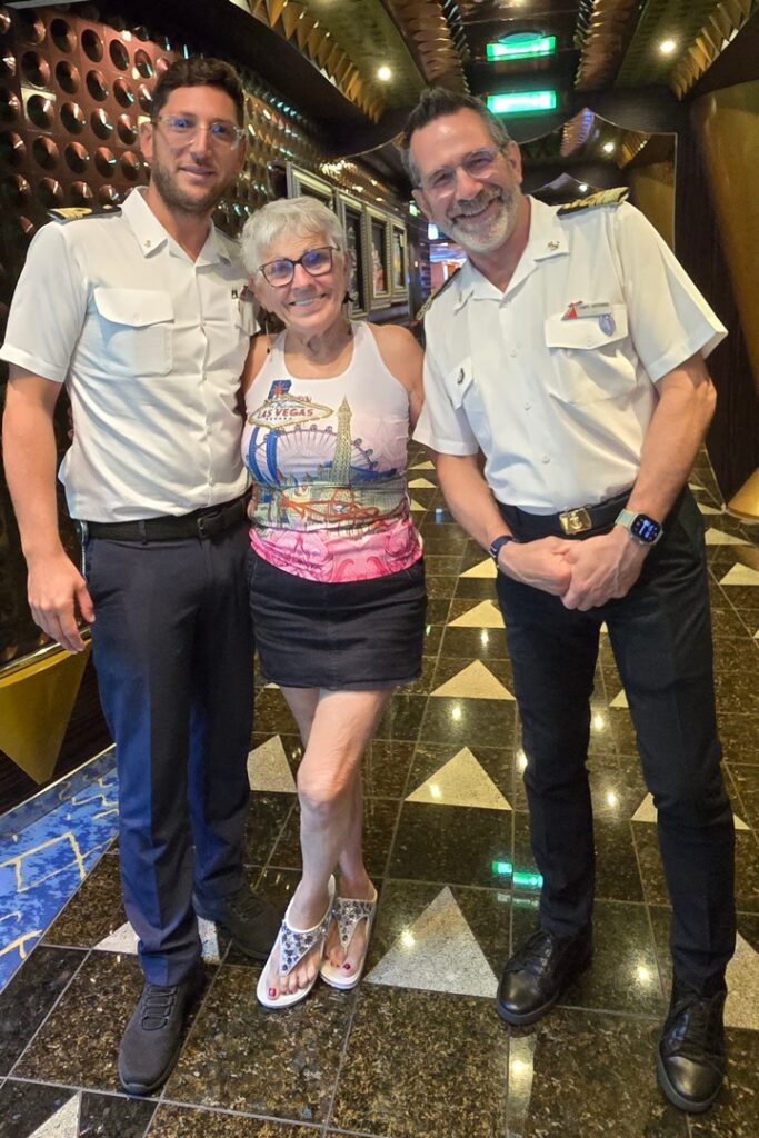 Another Day 12 feature was not one but TWO shows – a juggler, Zak McAllister, in the afternoon and “Vintage Pop,” a 30’s musical revue with some modern songs mixed in, in the evening. The ship band played for the evening show and, as always, they were terrific. Marlene got photos with the captain and some of the “Vintage Pop” cast.