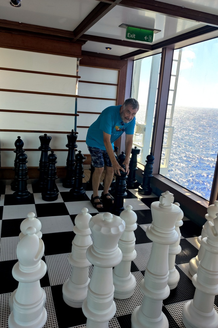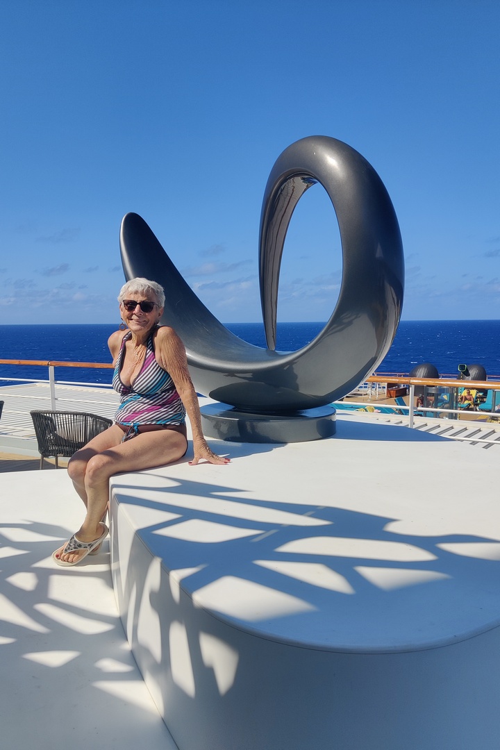 After breakfast on Day 17 I quickly lost $50 in the casino (down $775 now). Not a hint of a bonus even though I was mostly playing 25-cent slots. Disgusting. Then, after lunch and some time in the hot tub and pool, Marlene continued to whip my ass at rummy, winning 2 (to run her winning streak to 8) before I finally won one. Not a good day for games of chance.