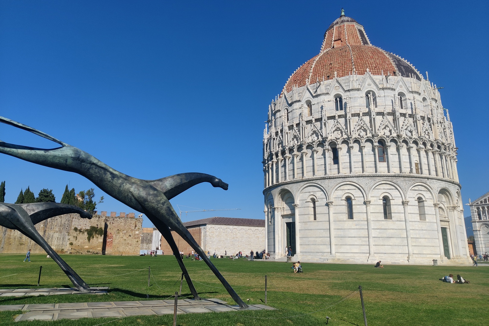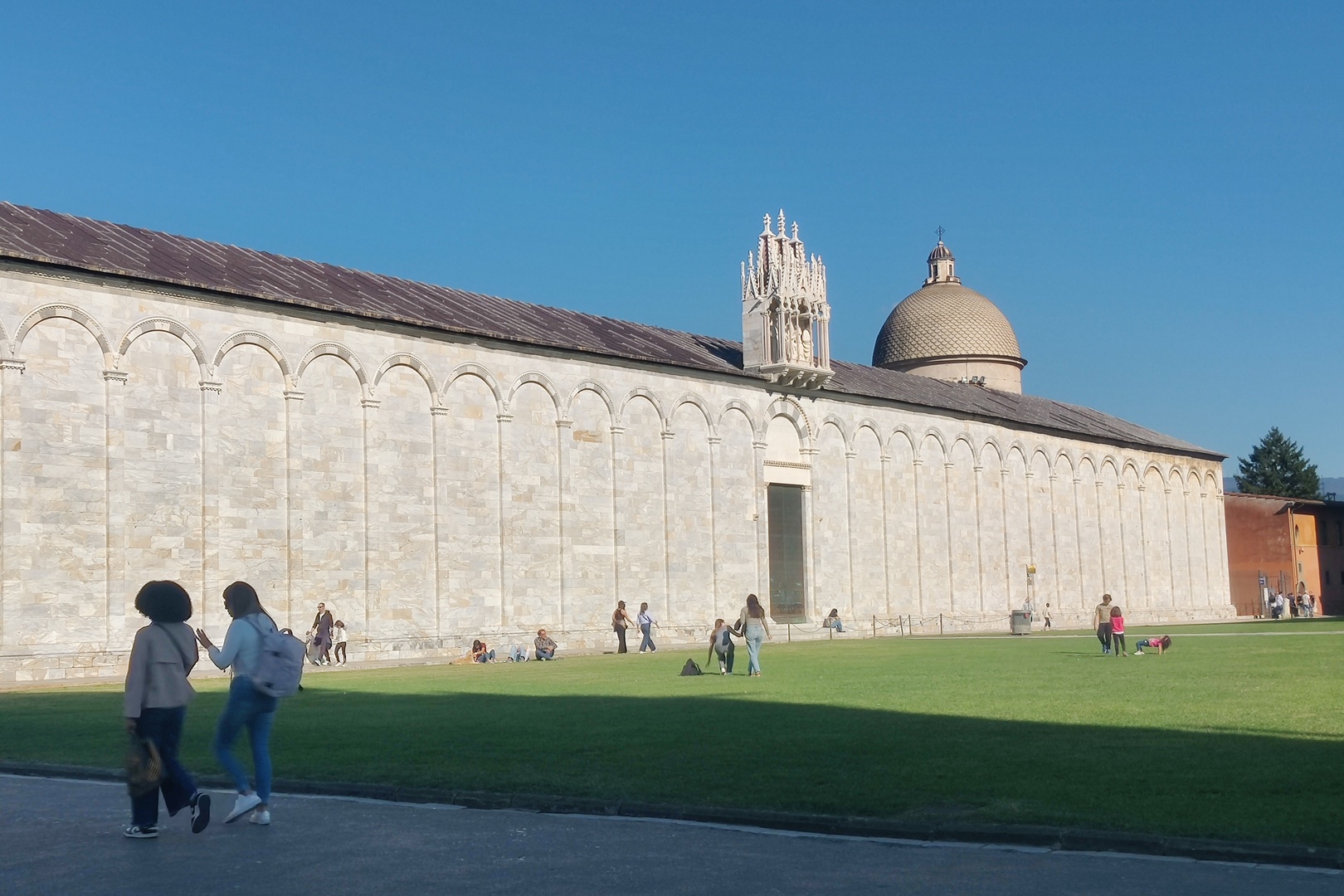 We found a no-cost parking spot not far from the Leaning Tower of Pisa – no small feat in a town crawling with tourists – and walked there, weaving through dozens of souvenir vendors. My first thought when passing through the wall into the compound where the tower is located: what are all those OTHER buildings. I had the impression that the tower stood alone but that is not the case; it is one of about 6 large and very impressive buildings in a walled compound.