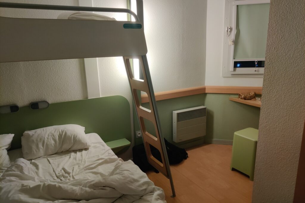 The hotel in Chambery – Ibis Budget Hotel Sud Chambery Challes-les-Eaux. We loved this place! Booking it was a bit of a risk. It was inexpensive – about $60 per night (the two nights were cheaper than the one night in Genoa) but it had good reviews. No elevator, but we left the suitcases in the car and just took our backpacks up one floor. The room was basic, but had everything we needed, including a table where I could blog.