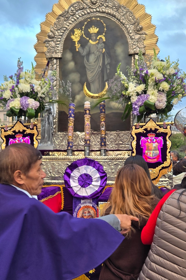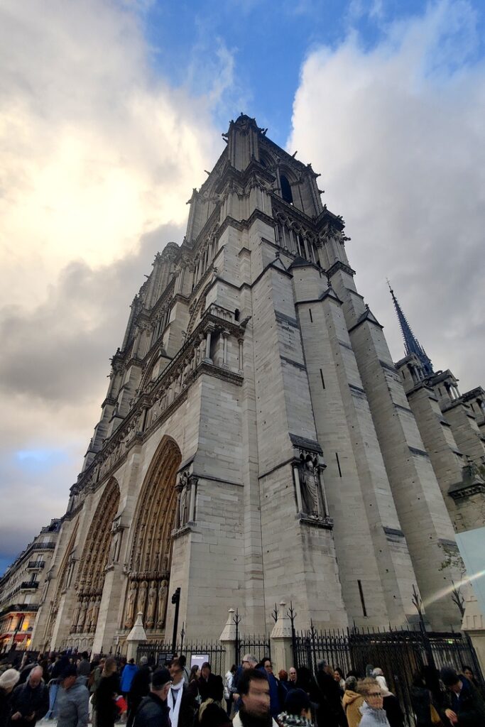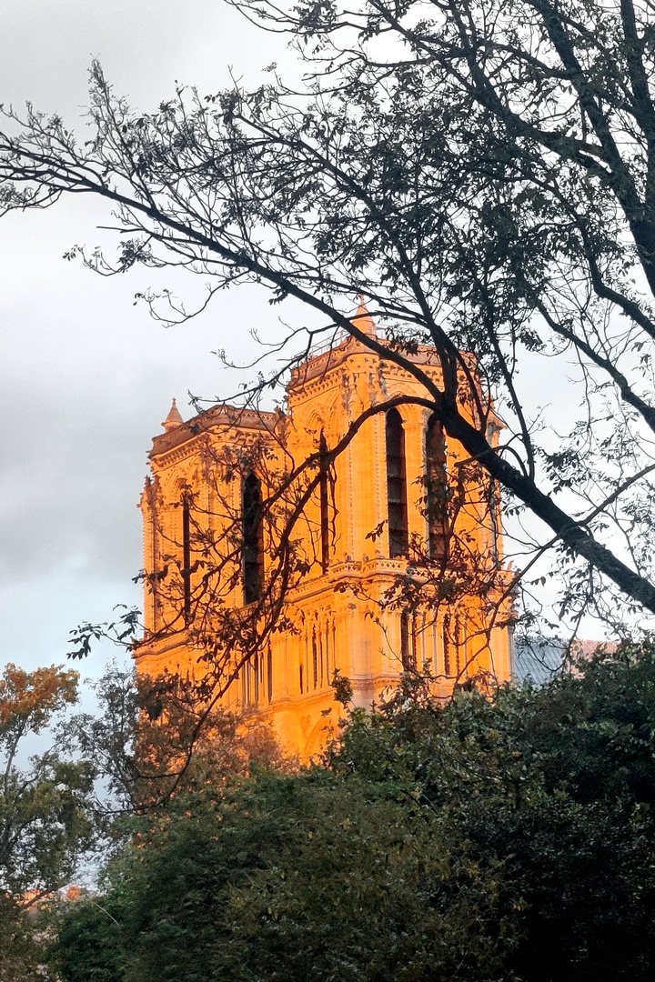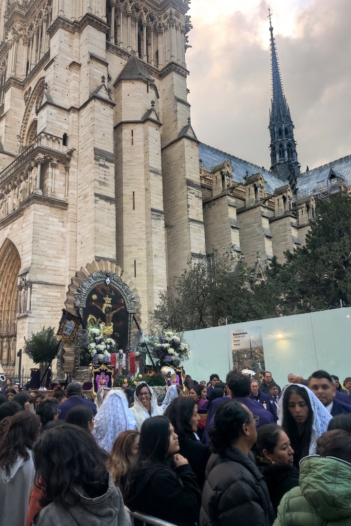 There was some kind of religious procession outside when we exited. Got a photo of that and, later, a wonderful photo of Notre Dame as the setting sun poked through the clouds.