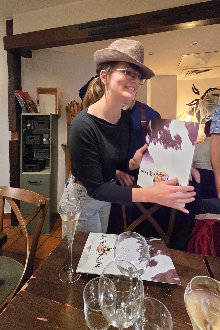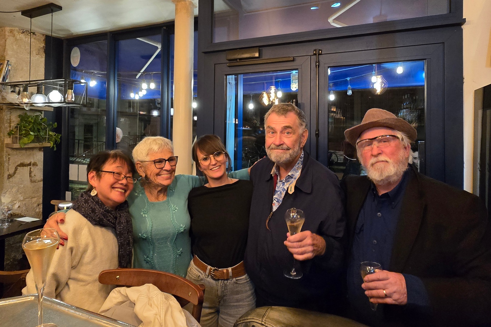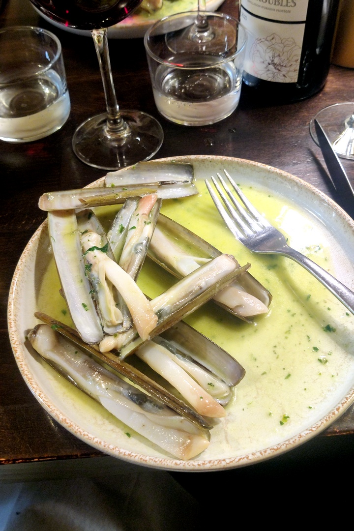 We then walked to Benjie and Junko’s neighborhood and had some mulled wine in the local cafe. Then we walked to dinner at La Pie Noir, a little family restaurant. We all had razor clams (never heard of them but they were terrific) and Marlene and I followed that with some delicious salmon. We shared profiterole for dessert.