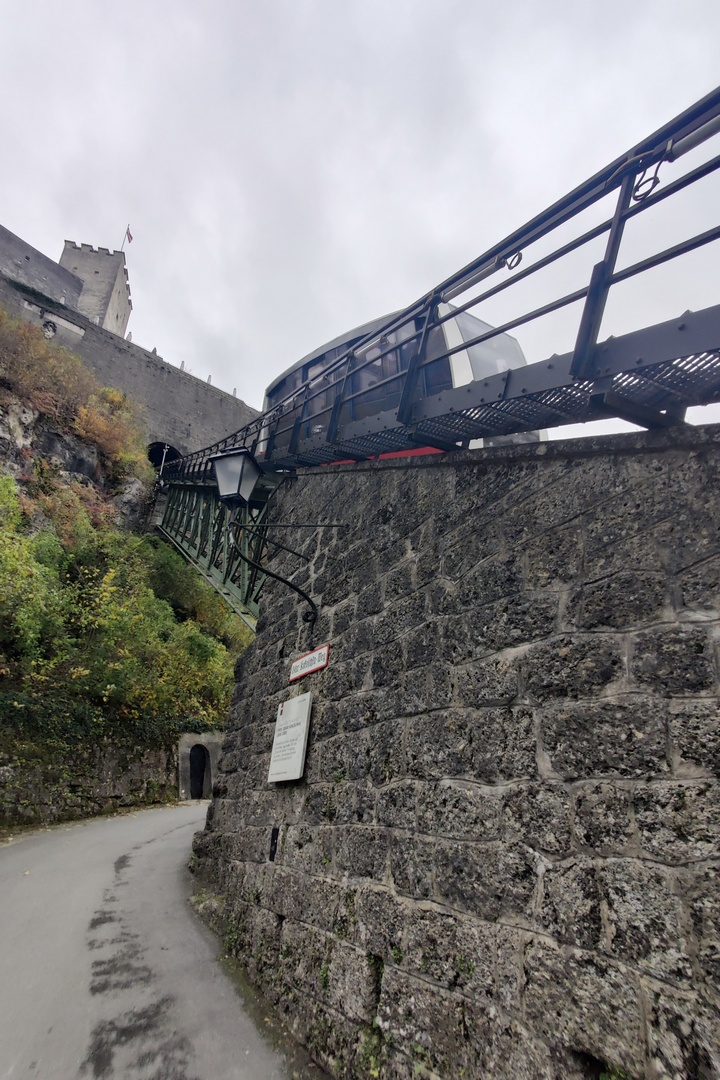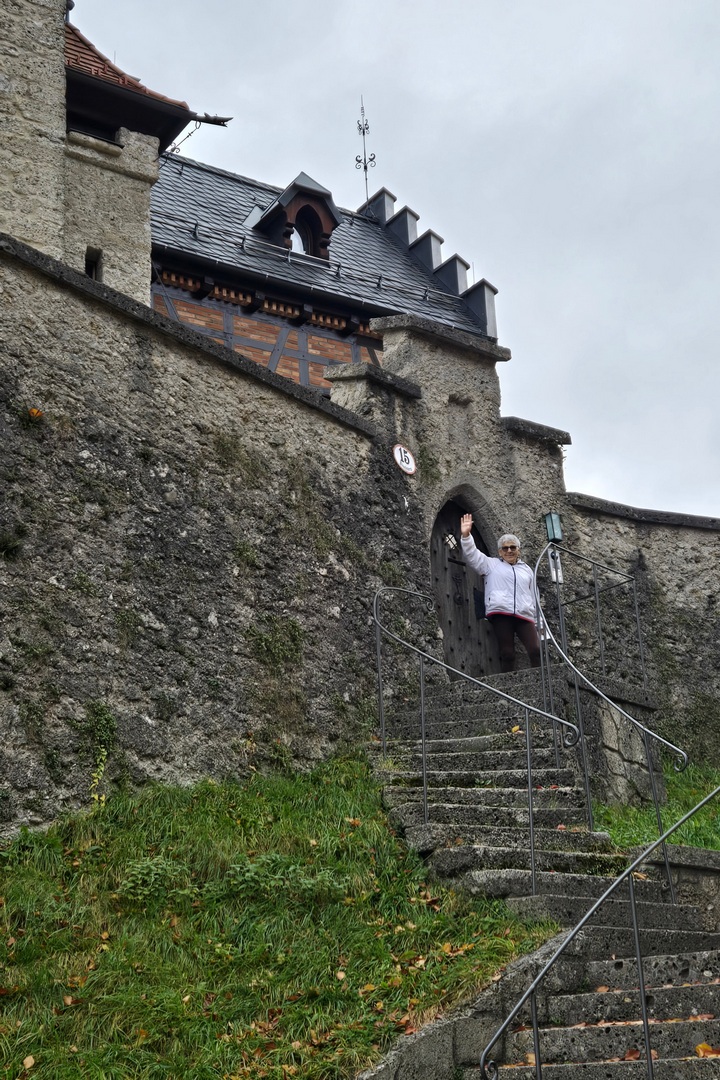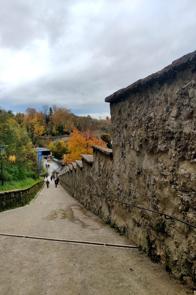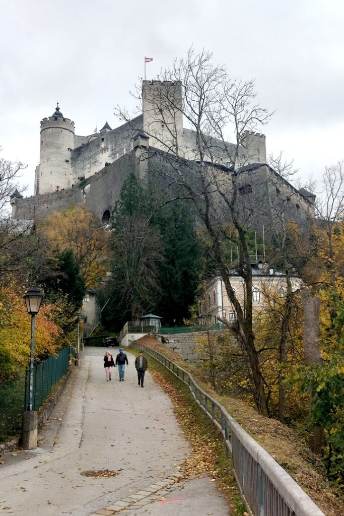 We managed to find Mozartplatz and then just wandered. We went into the Residenz and that led us io the Salzburg Cathedral. But we couldn’t get into the cathedral because a noon concert was in progress. So we went back into the square, did some shopping (yes, we bought a couple of souvenir magnets) and then started climbing toward the Hohensalzburg Fortress, a massive walled complex that lurks over the city.
