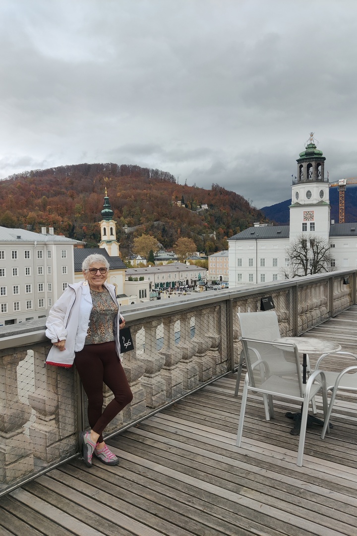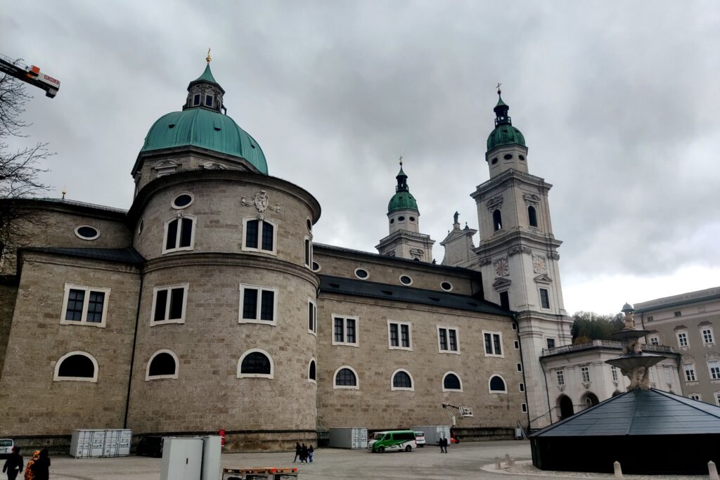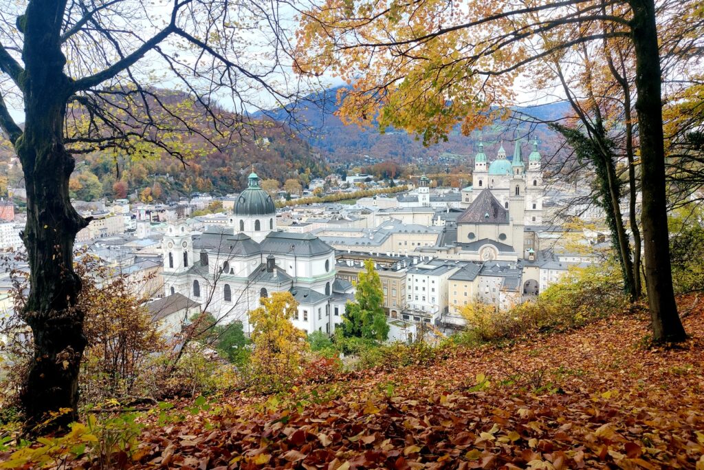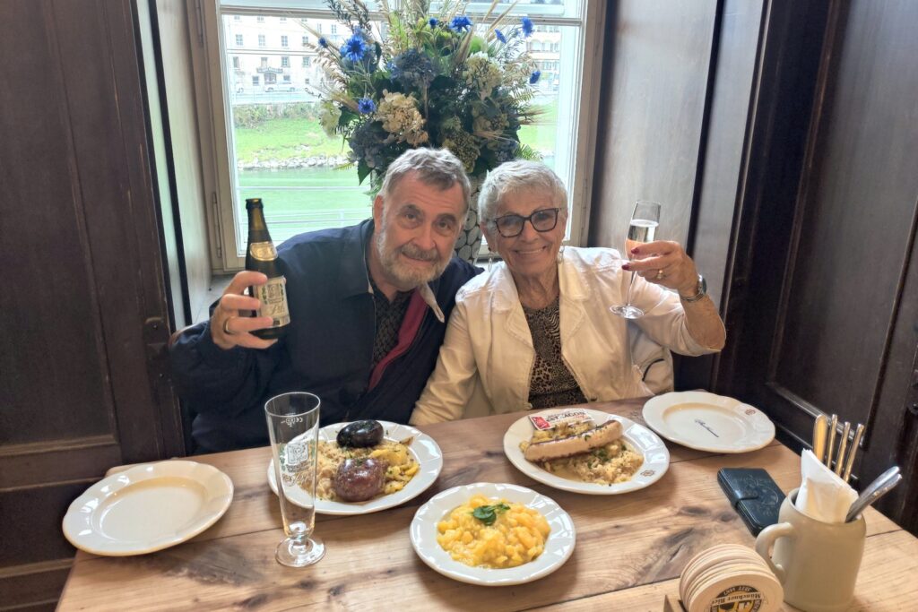 I got the day started by going to the market next to the hotel to get fresh bread and we had a breakfast of coffee and bread with butter and jam in the hotel room. We admired the nearby mountains as we ate – we didn’t see them upon arrival as it was very dark. After breakfast we headed into Salzburg for a day of sightseeing.