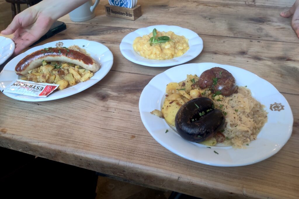 We stopped at several churches when we got back to town. Then we looked for a restaurant. Marlene really wanted a “bratwurst sampler” – a meal with bratwurst, fleischwurst and weisswurst. We couldn’t find that, exactly, but did find a 3-sausage meal at the Goldene Kugel.