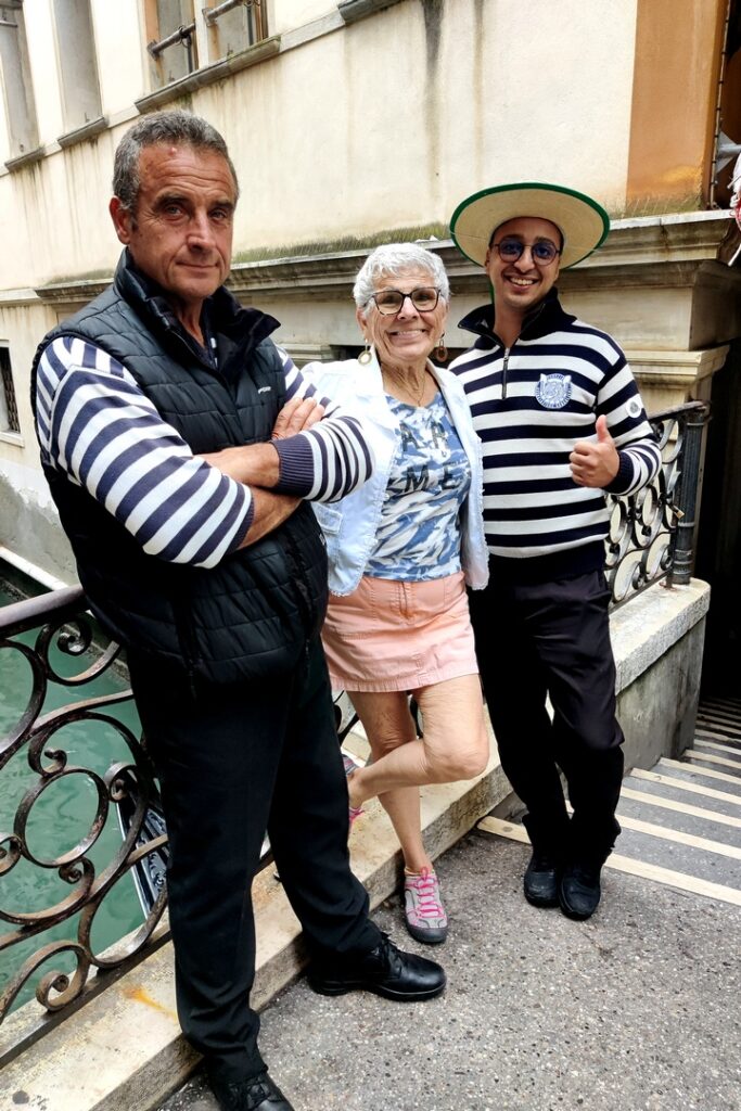 The walk back involved some more window shopping but took only about 90 minutes instead of the 4.5 hours. And we took a different route, so we saw different shops, different alleys and different bridges. And Marlene chatted up a couple of gondoliers.