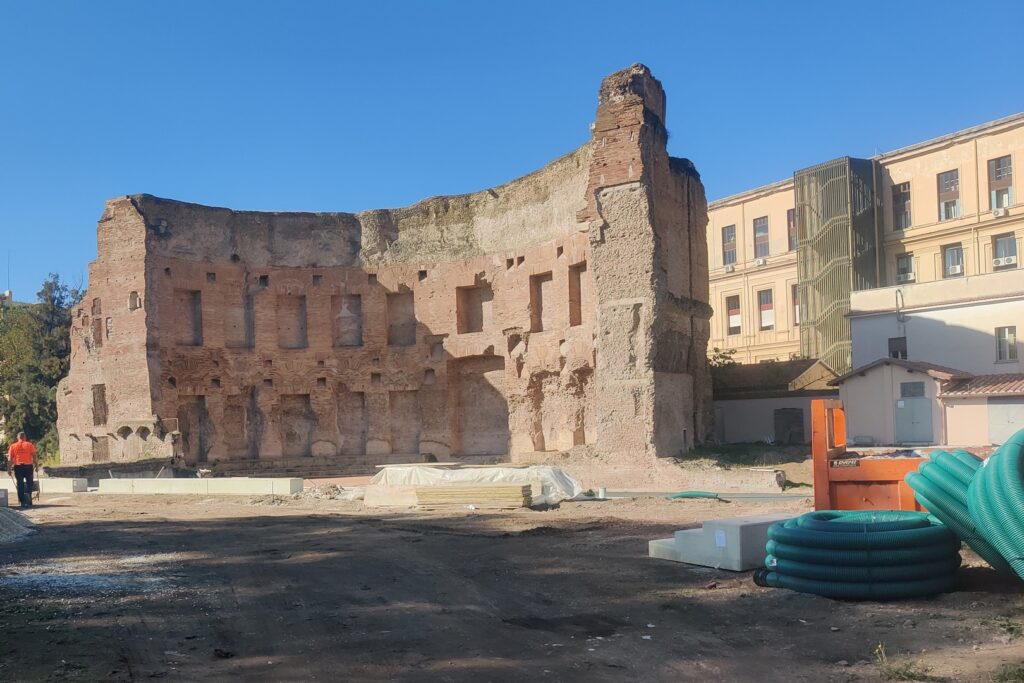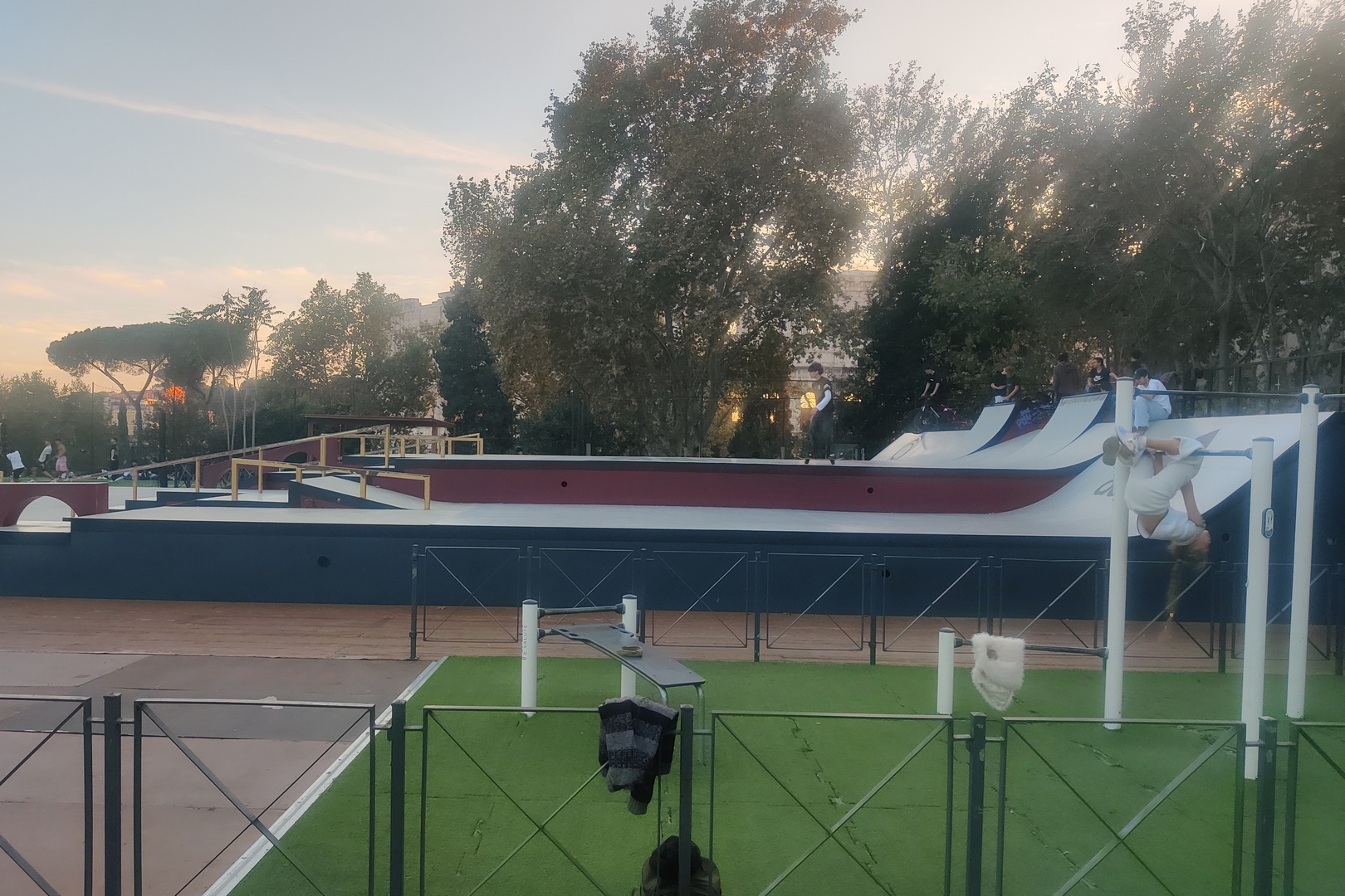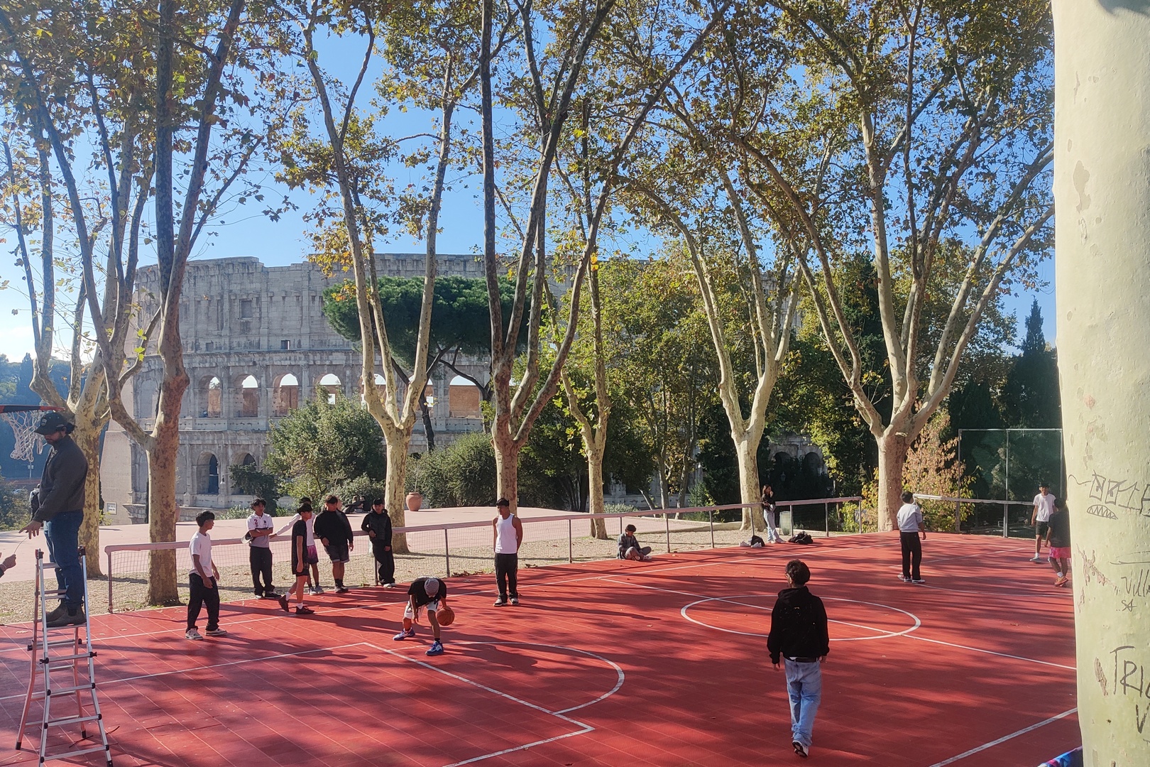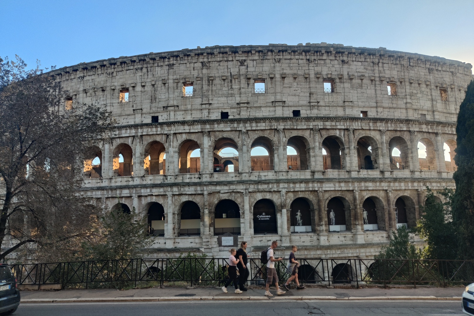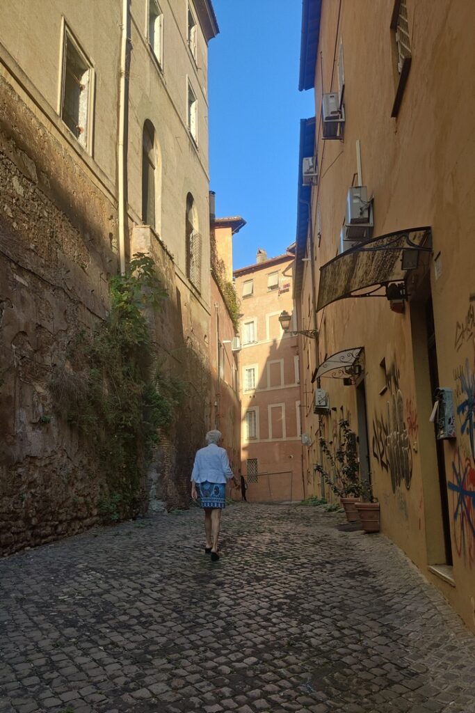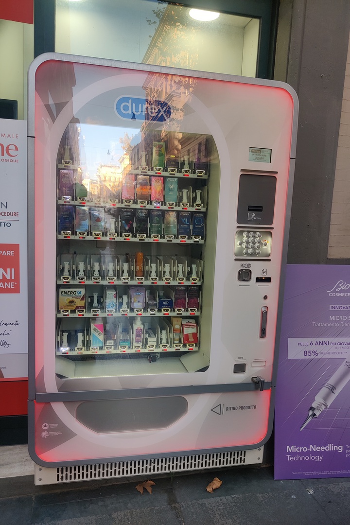 Our meandering route took us up the hill behind the hotel where there were some Roman ruins, past the skate park and the basketball game near the Colosseum, then down past the Colosseum. We were in search of a thrift store. Along the way we saw a condom vending machine – not something you see in the US. We found a thrift store and Marlene found a dress that she liked (I didn’t, but my opinion on fashion carries little weight). Then back to the hotel, getting gelato along the way. We had our usual bread-and-cheese dinner, with cold cuts. Yum.