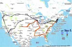 So with those basic parameters – 48 months, all 48 states, summers north, winters south – I set out to solve that little routing problem. Plus, of course, we had to start in MA on July 1, 2012, and because gas is expensive we would like to keep the miles low. And let’s give every state, no matter how small and insignificant (this one’s for you, North Dakota!), a full week. And give every state an even number of weeks just to keep the accounting simple. Maybe try to hit VA and MA multiple times, too, as we have family in both places.
