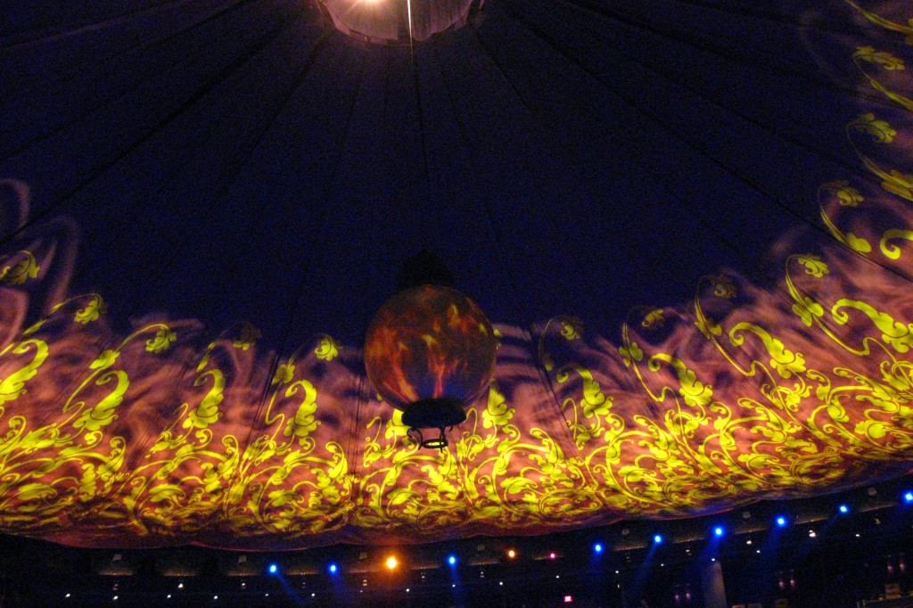 Like the KA theater, this one rises nearly 100 feet into the air (actually 82 feet, as I found out later). In this theater the dome is a major entry and exit point – many actors drop down from the ceiling or are raised to the roof to exit. It is on the lines that drop from the ceiling on which the most incredible acrobatics are performed. In some cases couples engage in a variety of twisting, spinning movements while dangling 40 or 50 feet above the surface. Falling from there might not kill, but it would certainly hurt. And in some scenes actors are raised to the dome while being held only in wrist grips.