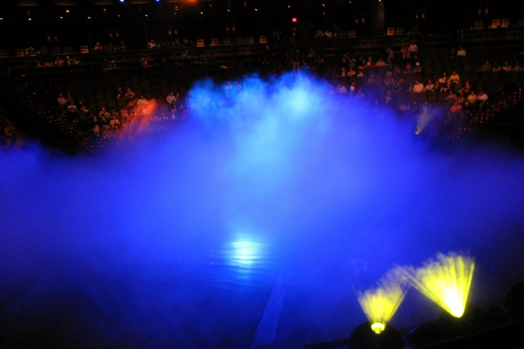 As with KA, one of the big stars of this show is the stage. It is also hydraulic and undergoes many transformations. But this is essentially a show that features aquatic acrobatics and it does this superbly. Many of the scenes involve actors rising from beneath the surface of the water, so there are obviously underwater entry and exit points. One scene involving Ester William-like “legs above the surface” synchronized choreography has the swimmers under water for nearly 5 minutes, so there must be underwater breathing capability. And while some of the scenes involve a dry platform, others require deep dives, so the platform can very quickly and quietly raise and submerge.