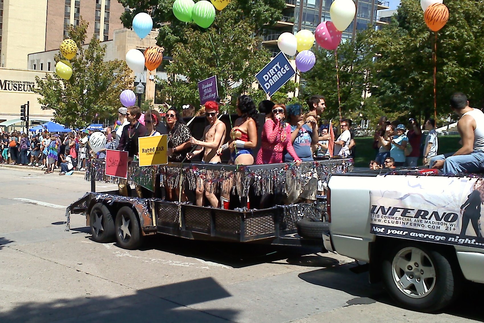 The weekend ended with a small brunch at Benj and Junko’s condo very near The Square, the elevated couple of acres that marks the center of Madison and on which the state capitol – arguably the most beautiful state capitol building anywhere – is situated. I had a little extra time that morning and it was a beautiful day, so I wandered around the city taking some photos. The Square was closed to traffic – for some kind of street fair it appeared – but as I was returning from my photo walkabout I ran smack dab into the middle of a Gay Pride parade. As I said, Madison is never dull. I can’t imagine why I found it boring when I was a kid.