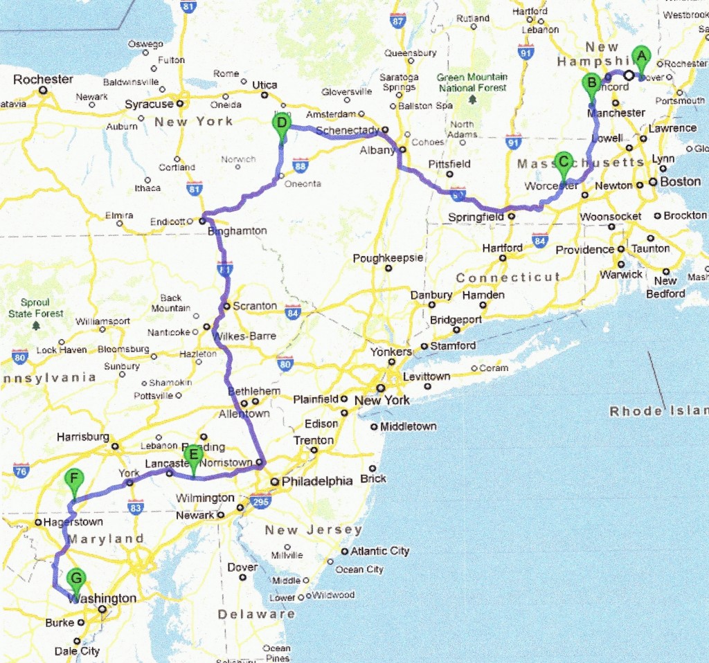 The starting point, of course, is the Saddleback Campground in Northwood, NH. The destination is a campground in Reston, VA, where we plan to spend a week with the Jett’s sons and the grandkids before heading west. The stops along the way are as follows:
